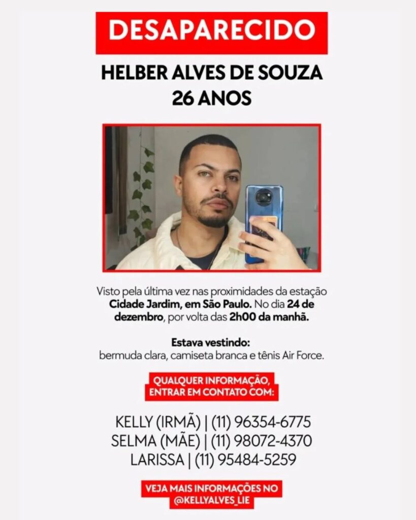O produtor audiovisual Helber Alves, de 26 anos, segue desaparecido desde a madrugada do dia 24 de dezembro, na Grande São Paulo. Ele foi visto pela última vez por volta das 2h, na estação Cidade Jardim, na zona oeste da capital, segundo informações repassadas por familiares. Passados 12 dias do desaparecimento, o caso continua sem esclarecimentos e é investigado pela Polícia Civil.
