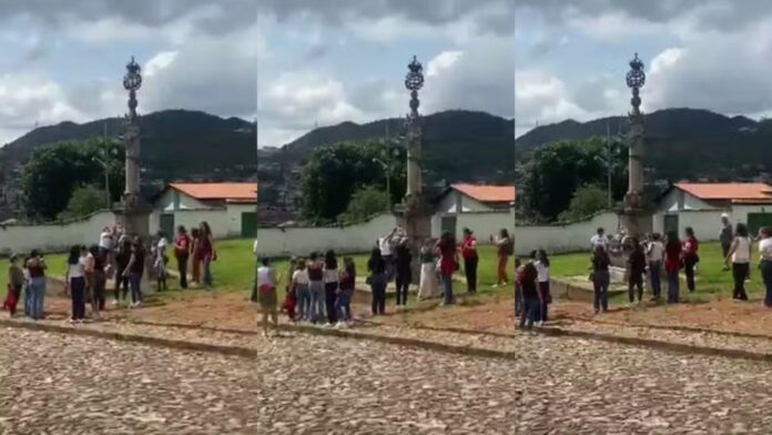 Um novo vídeo que circula nas redes sociais expõe um grupo de turistas no Pelourinho de Mariana, na Região Central de Minas Gerais, simulando uma cena de tortura no monumento histórico.