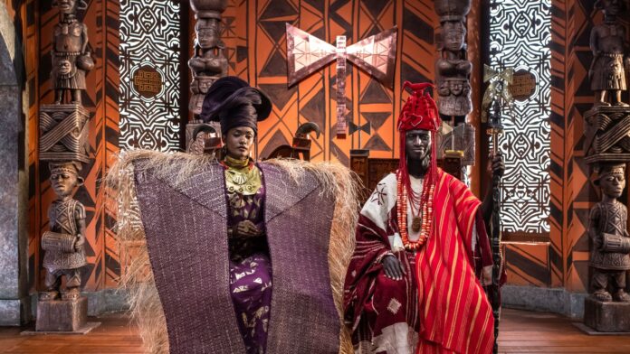 Na reprodução da fortaleza nos Estúdios Globo, estão ambientes importantes para a história. A sala do trono, um dos mais emblemáticos, conta com madeira entalhada, bandeiras e pinturas feitas à mão, que transformam o ambiente numa expressão da opulência africana. Dois tronos foram criados, cada um com tipologia própria, relacionados a dois orixás da cultura iorubá: Iansã, para o trono da rainha, e Xangô, para o trono do rei. Paula explica que a escolha estética valoriza sempre o que seria feito por muitas mãos, não por processos fabris.